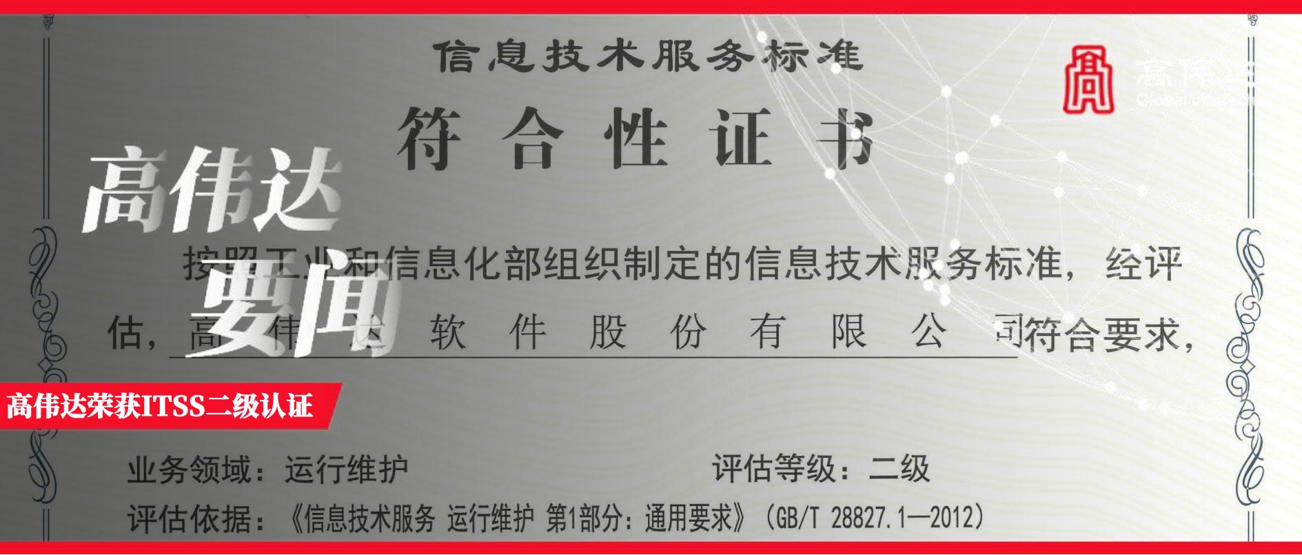 2025年3月14日,高偉達正式通過中國電子工業標準化技術協會信息技術服務分會(ITSS分會)的嚴格審核,榮獲《信息技術服務運行維護服務能力成熟度模型》(ITSS.1-2015)二級資質認證(全國ITSS體係中,僅有10%左右的企業通過測評,最終獲得二級資質)。